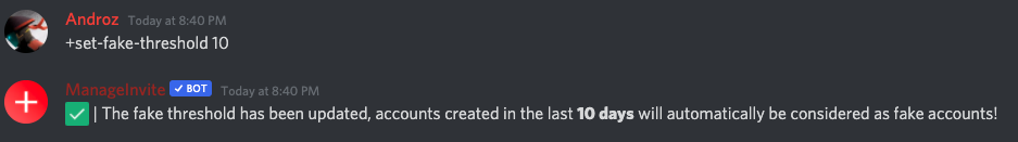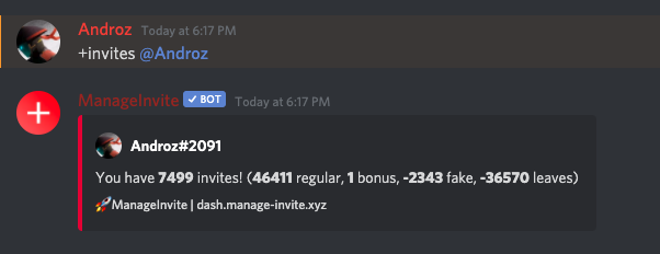 ManageInvite counts the invites and is able to categorize them, in 4 different types : the regular invites, when a member invites someone else in the server, the bonus ones, when an administrator adds invites to an account, the fake invites, when a member tries to invite the same person twice to gain more invites and the leave invites, when someone invited by the member left the server.